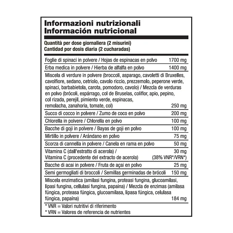 Foglie di spinaci in polvere (Spinacia oleracea, foglia), erba medica in polvere (Medicago sativa, erba con fiori), edulcorante (xilitolo), miscela di verdure in polvere (broccoli (Brassica oleracea, erba con fiori), asparago (Asparagus officinalis, rhizoma), cavoletti di Bruxelles (Brassica oleracea, erba con fiori), cavolfiore (Brassica oleracea, erba con fiori), sedano(Apium graveolens, foglia), cetriolo (Cucumis sativus, frutto), cavolo riccio (Brassica oleracea, erba con fiori), prezzemolo (Petroselinum crispum, foglia), peperone verde (Capsicum annuum, frutto), spinaci (Spinacia oleracea, foglia), barbabietola (Beta vulgaris, radice), carota (Daucus carota, radice), pomodoro (Lycopersicon esculentum, frutto), cavolo (Brassica oleracea, erba con fiori)), addensante (gomma di xanthan), succo di cocco in polvere (Cocos nucifera, frutto), semi germogliati di broccoli (Brassica oleracea, semente), miscela enzimatica (amilasi fungina, proteasi fungina, glucoamilasi, lipasi fungina, cellulasi fungina, papaina), estratto di frutto d'acerola (Malpighia glabra, frutto), tallo di chlorella vulgaris (Chlorella vulgaris, tallo), bacche di goji in polvere (Lycium barbarum, frutto), mirtillo in polvere (Vaccinium myrtillus, frutto), scorza di cannella in polvere (Cinnamomum cassia, scorza), edulcorante (glicosidi steviolici da stevia), antiossidante (acido citrico), bacche di acai in polvere (Euterpe oleracea, frutto), correttore di acidità (acido malico).