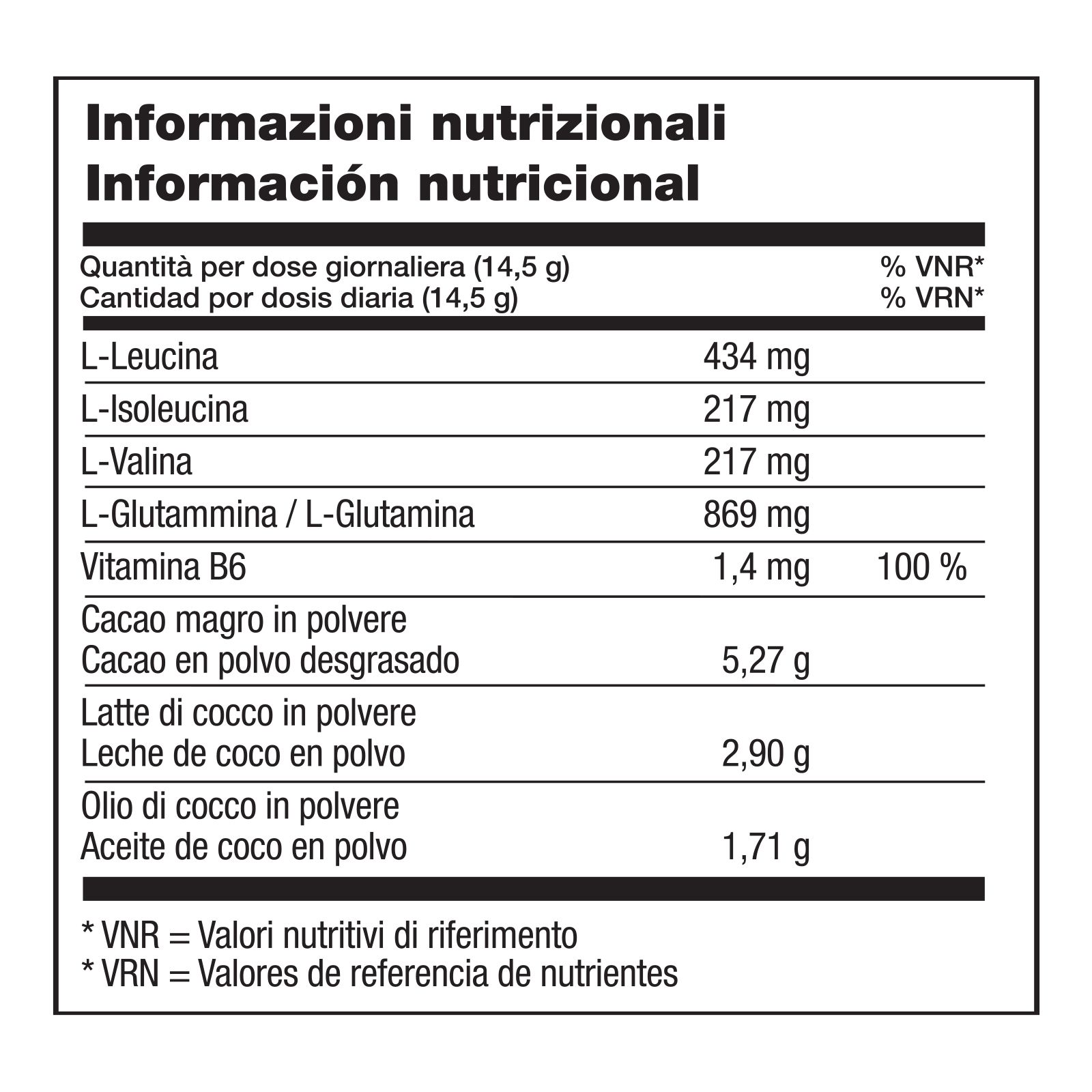 Cacao in polvere (36%) (Theobroma cacao, seme), latte di cocco in polvere (Cocos nucifera, frutto), olio di cocco in polvere (Cocos nucifera, frutto), edulcorante (xilitolo), miscela di aminoacidi a catena ramificata (L-leucina, L-isoleucina, L-valina), L-glutammina, trigliceridi a catena media in polvere, aromi naturali, emulsionante (lecitina di girasole), addensante (gomma di guar, gomma di xanthan), edulcorante (glicosidi steviolici da stevia), sale (cloruro di sodio), piridossina HCl.